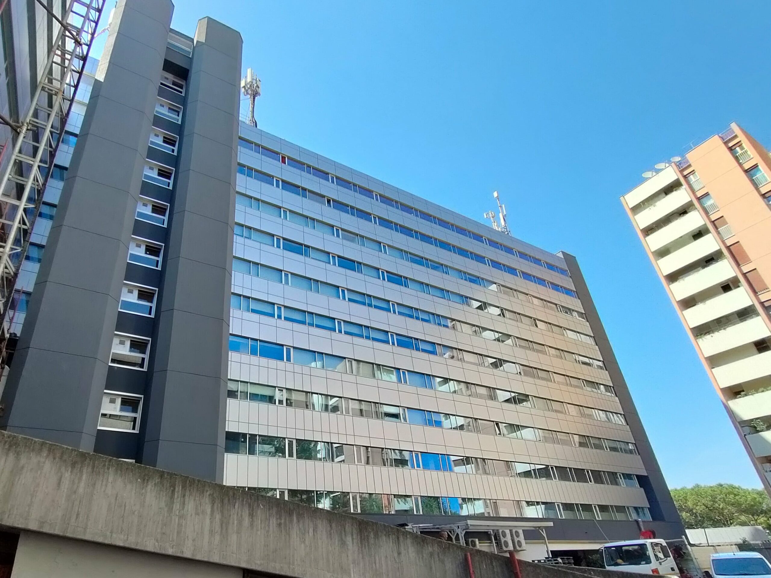 Façade montant-traverse, fenêtres et bardage